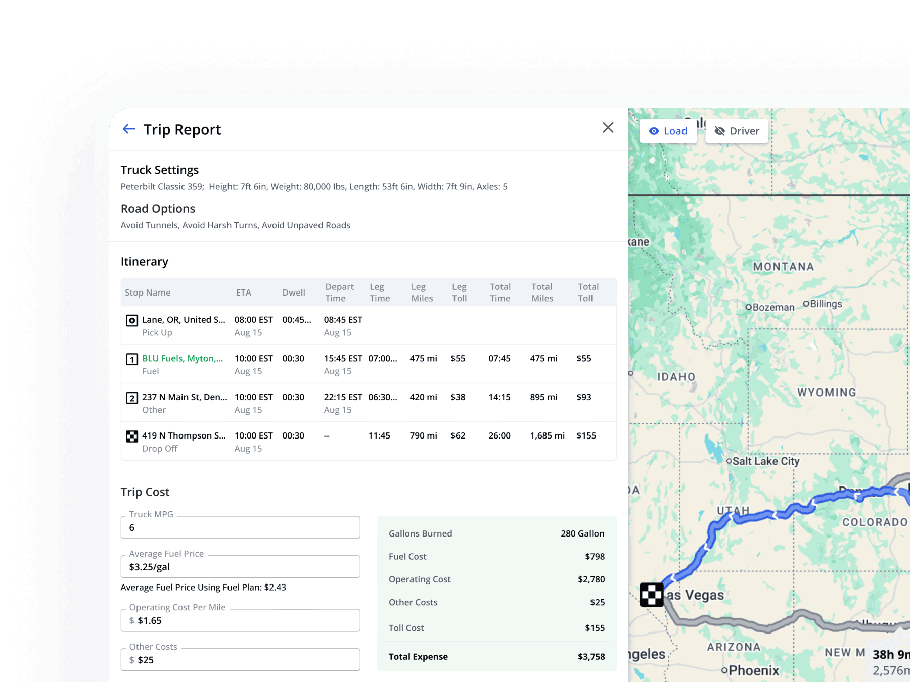 Every route comes with a trip report—stop list, depart/arrive times, tolls, and mileage. Add fuel price, MPG, and cost-per-mile to see the real expense before the load moves.