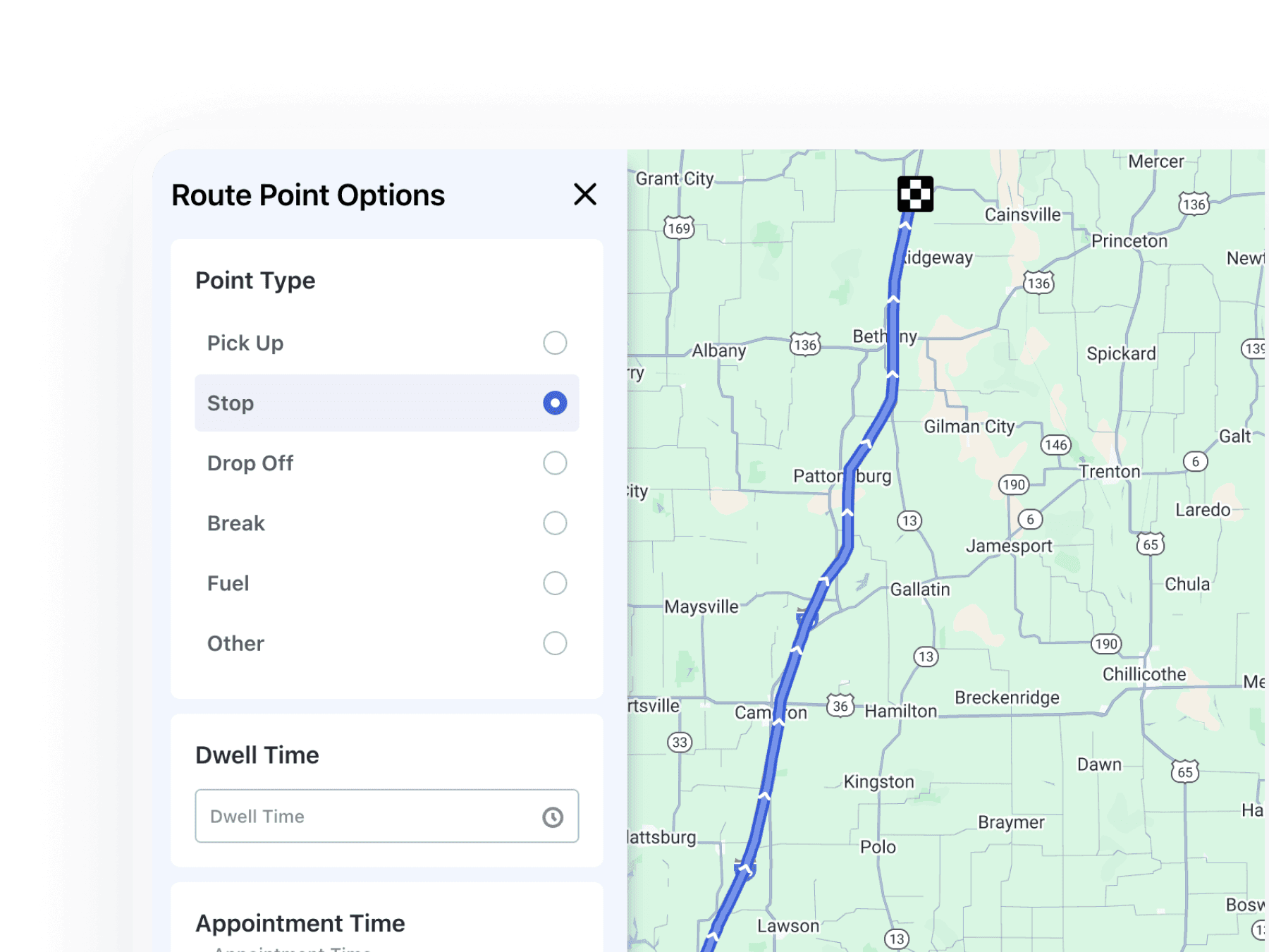 Mark any point as Pick Up, Drop Off, Stop, Break, Fuel, Other. Add Dwell Time and Appointment Time and we’ll roll it into ETAs automatically. Leave Notes for drivers and yard guards.