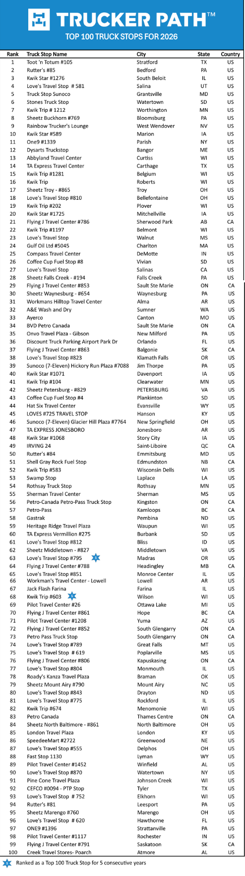 “We are proud to showcase the nation’s top facilities for truck drivers,” said Chris Oliver, CMO at Trucker Path. “This year, we are also naming the truck stops that have been selected by the Trucker Path community as one of the nation’s Top 100 annually for each of the past five years. That significant achievement, and the recognition for all winners, means their customers can count on these truck stops to help make truckers’ lives on the road easier.”